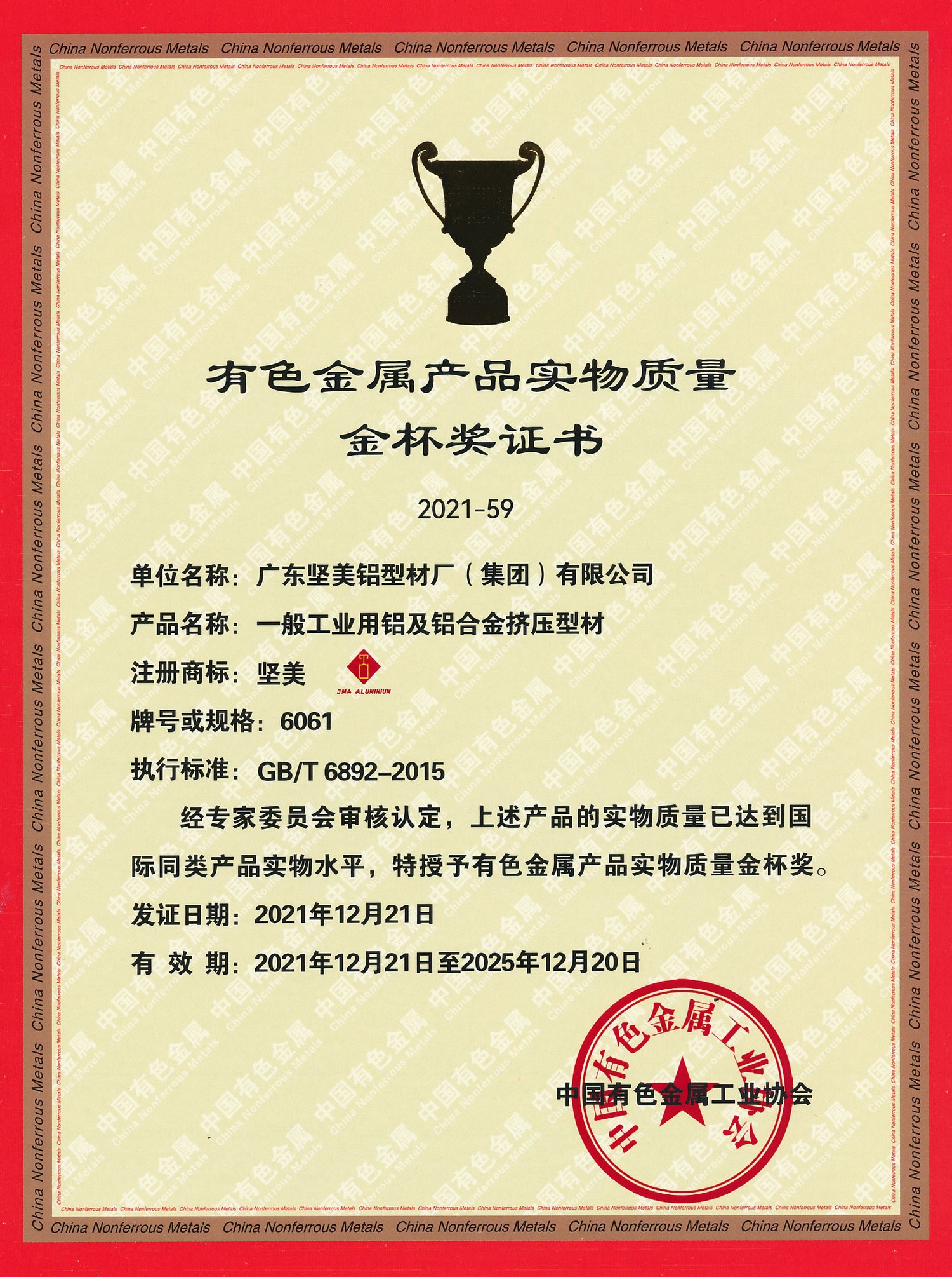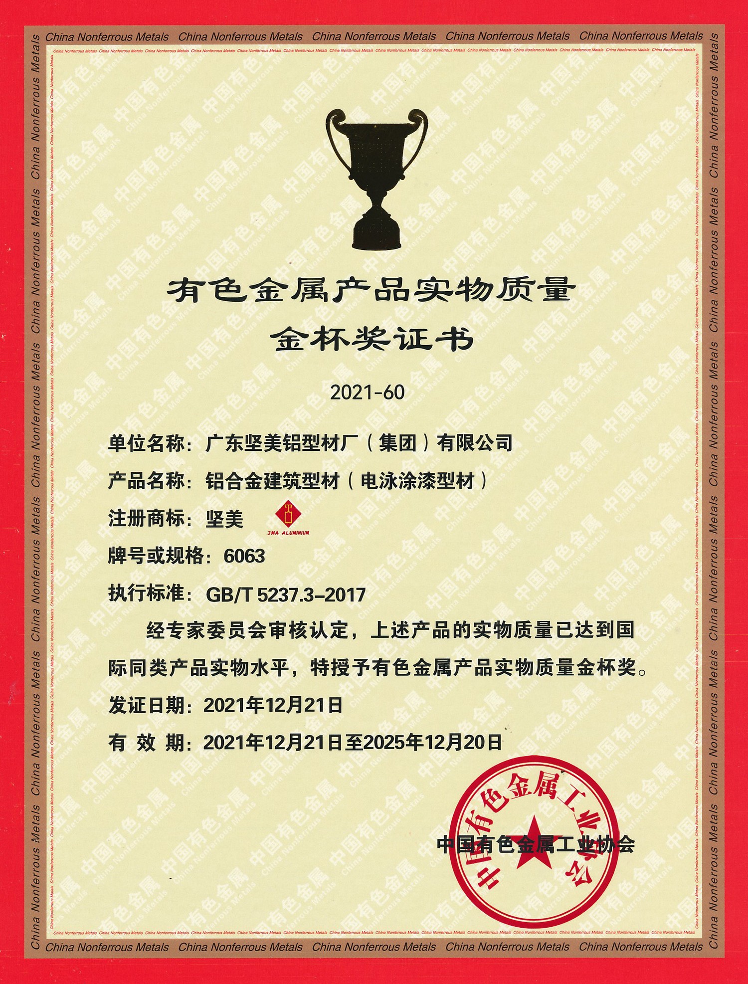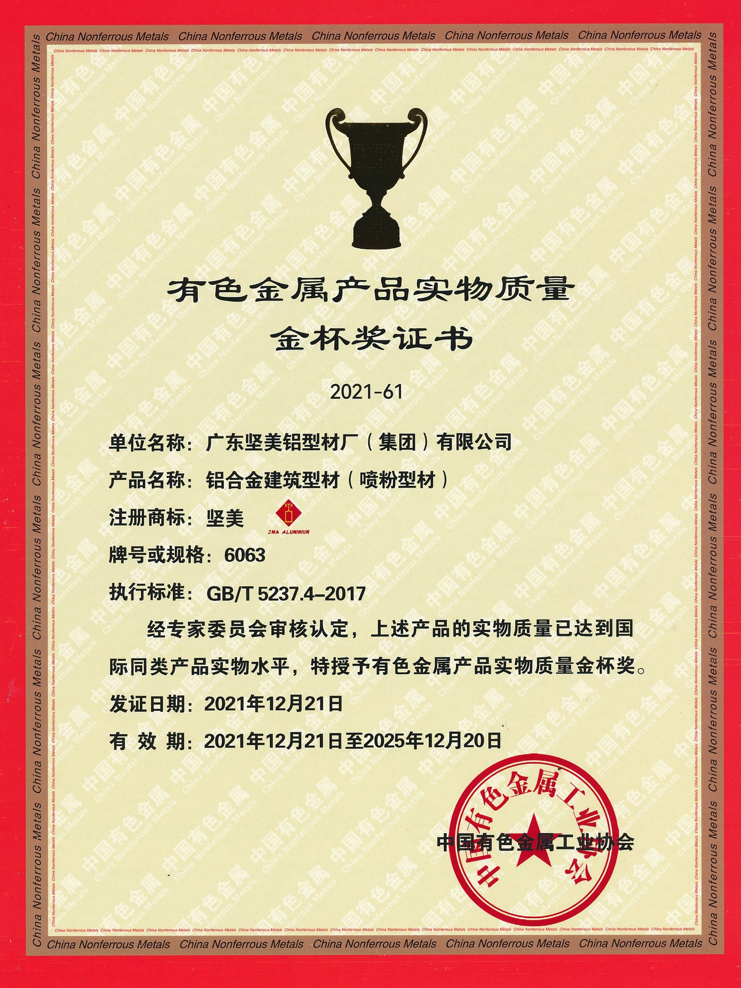 • 2021年金杯獎證書 一般工業(yè)用鋁及鋁合金擠壓型材 中文(中國有色金屬工業(yè)協(xié)會)