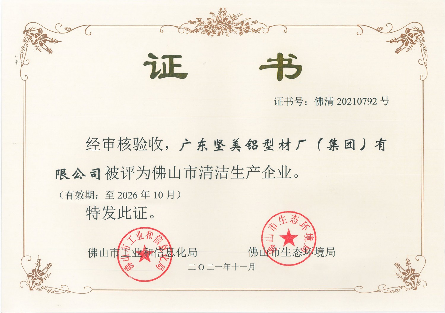 • 2021年11月 佛山市清潔生產(chǎn)企業(yè)