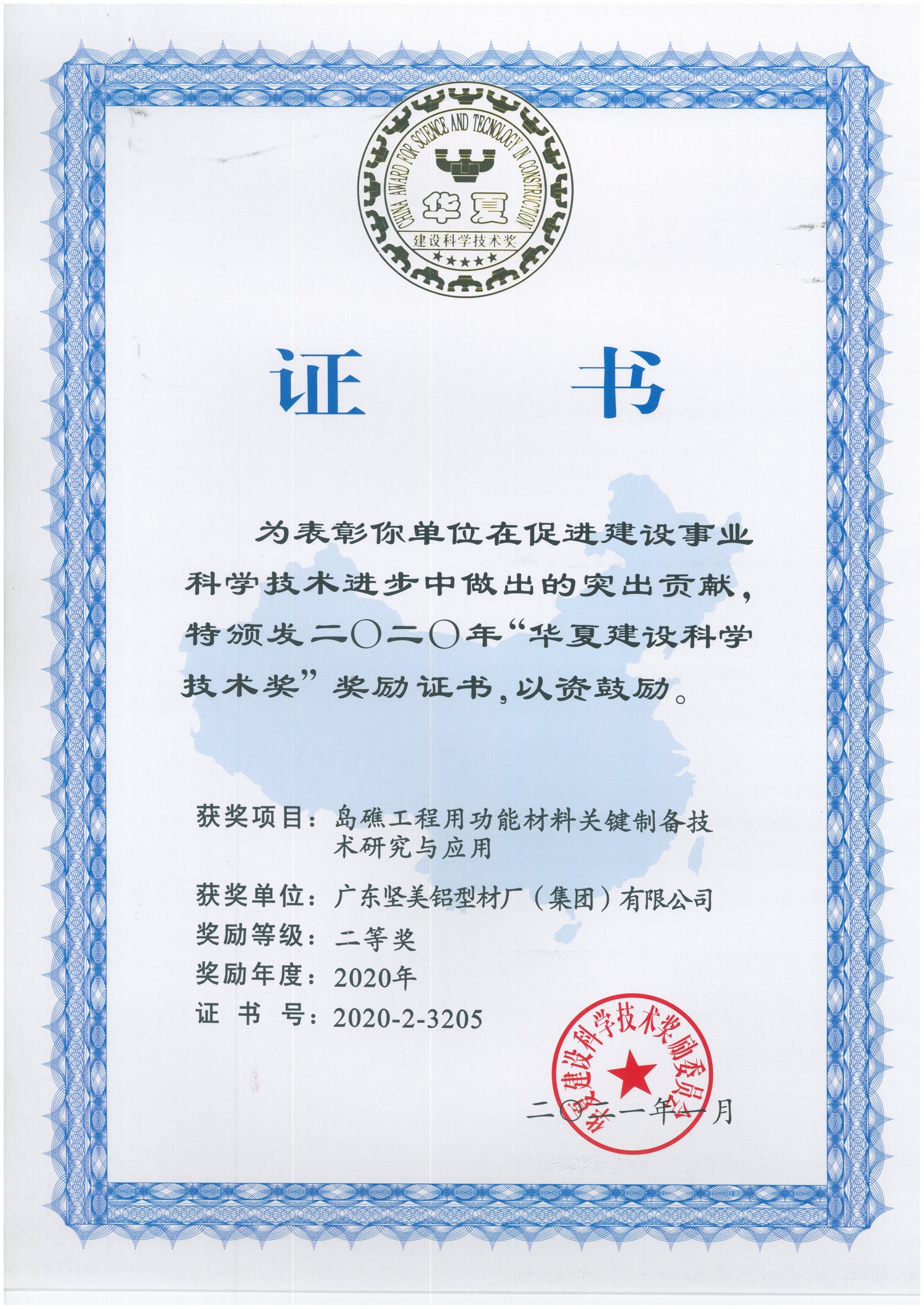• 2021年1月 2020年華夏建設(shè)科學(xué)技術(shù)獎(二等獎):島礁工程用功能材料關(guān)鍵制備技術(shù)研究與應(yīng)用:廣東堅美(華夏建設(shè)科學(xué)技術(shù)獎勵委員會)